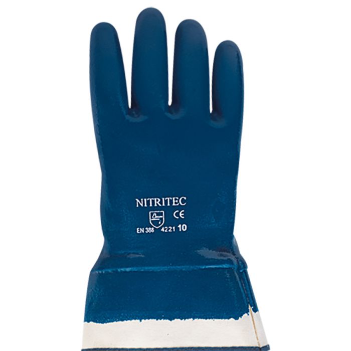 MARAL-Schutzhandschuhe aus moltoniertem Baumwolltrikot mit Vollbeschichtung, Farbe dunkelblau, Schichtstärke 0,5 mm, glatte Oberfläche, Segeltuchstulpe, Männergrösse 10. Abrieb-, stich- und schnittfeste Handschuhe für grobe Arbeiten mit rauen und scharfkantigen Materialien, auch bei Einwirkung von Öl und Fett.